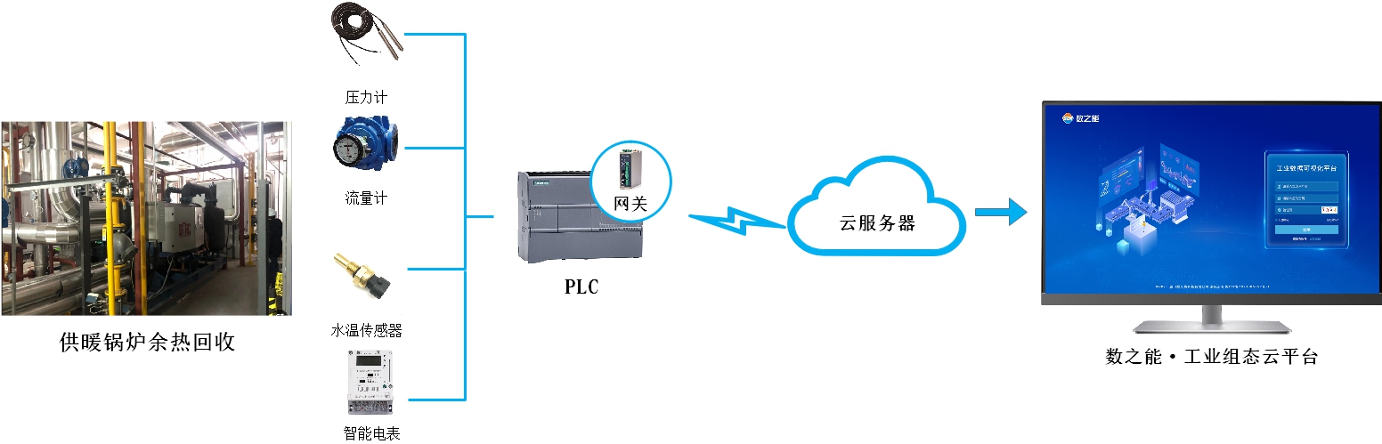 對(duì)此,數(shù)之能提供基于“數(shù)據(jù)采集網(wǎng)關(guān)+工業(yè)組態(tài)云平臺(tái)”的余熱回收能效監(jiān)測(cè)物聯(lián)網(wǎng)系統(tǒng)方案。通過(guò)接入控制器PLC、智能電表等設(shè)備,系統(tǒng)能夠?qū)崟r(shí)采集煙氣出入口溫度、進(jìn)出水溫度、瞬時(shí)流量、回收功率、回收熱量、能耗等數(shù)據(jù),實(shí)現(xiàn)工業(yè)組態(tài)云平臺(tái)對(duì)余熱回收工藝的可視化展示、監(jiān)控、告警、控制、管理與分析等功能,為供暖節(jié)能與可靠運(yùn)行提供數(shù)智化支持,提高工作效率與能源利用效率,減低能耗成本。